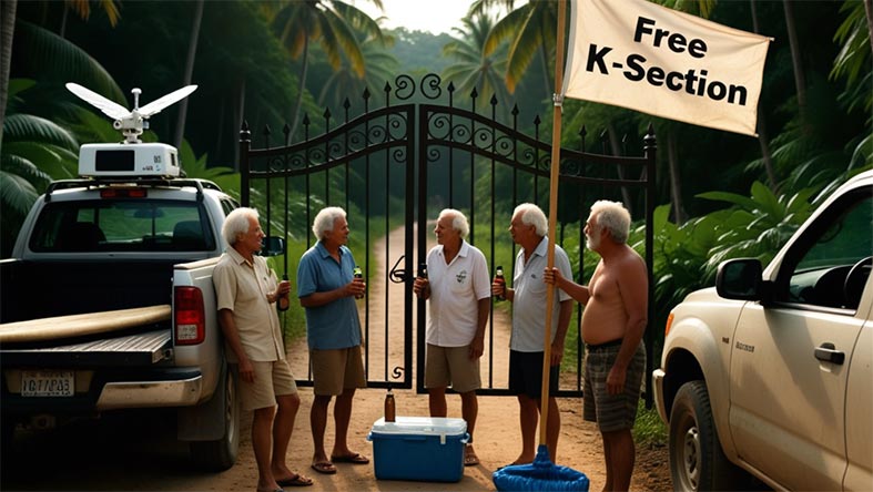 The rebel flags of Free K-Section – with their Starlink logo and Whatsapp chat q-code – were fluttering in the wind yesterday when Nosara Lately was granted access to the newly established rebel enclave near El Bosque. Toyota pickups with surf racks and barrels of molasses were parked menacingly near several orange traffic cones that bore a suspicious resemblance to the cones stolen from Organico several days ago.